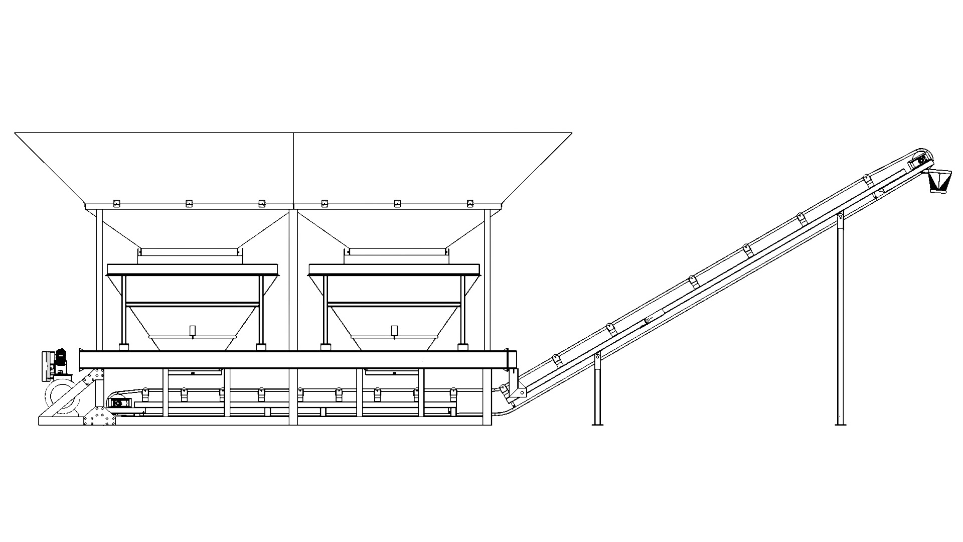 Accumulative stationary concrete batching plant with 2 independent batching hoppers for weighing aggregates and a cumulative aggregate ship for greater capacity.